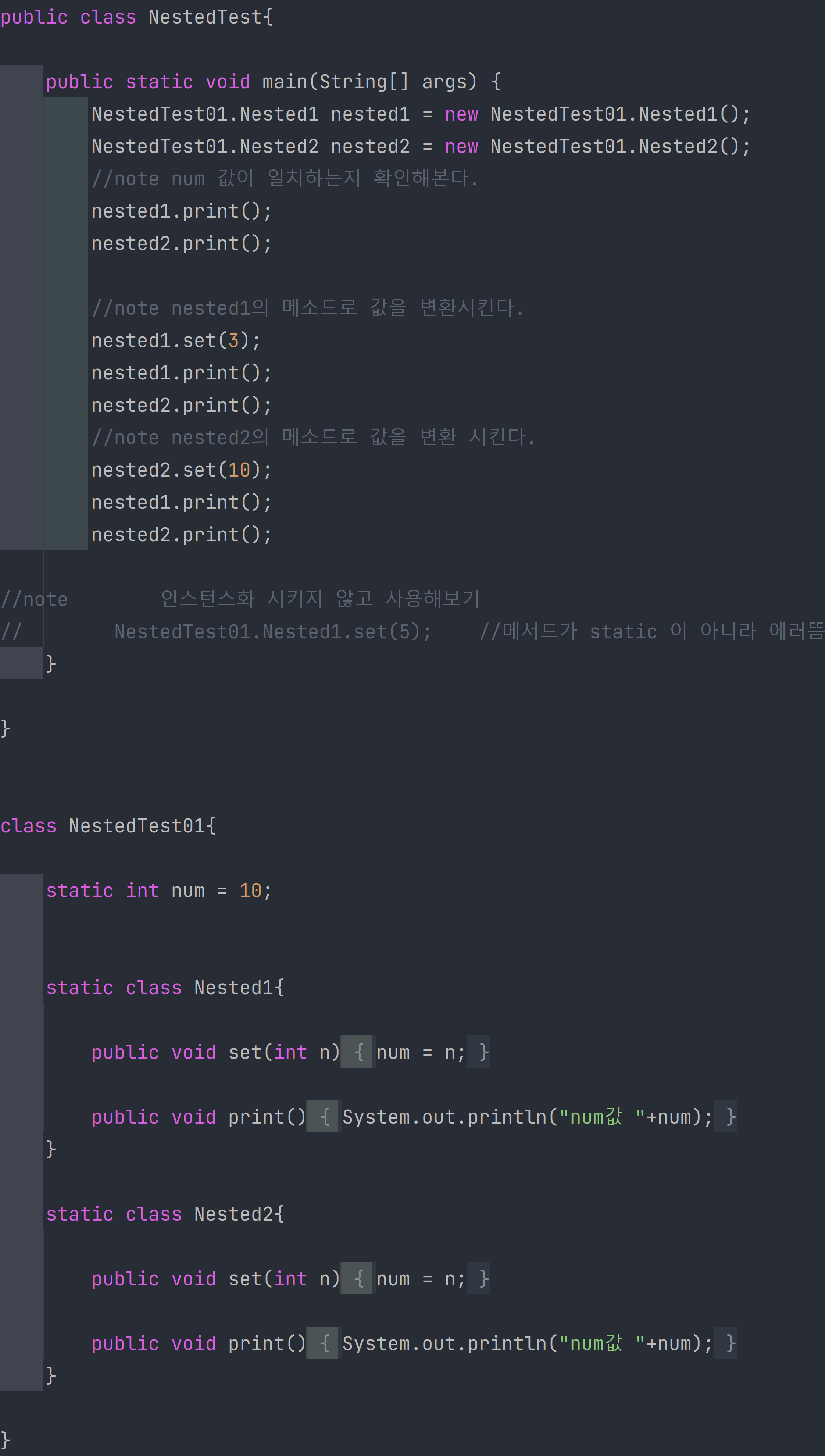 이때 num을 앞에 NestedTest.num 이런식으로 사용하는 것이 아닌 num이라고 사용한다.