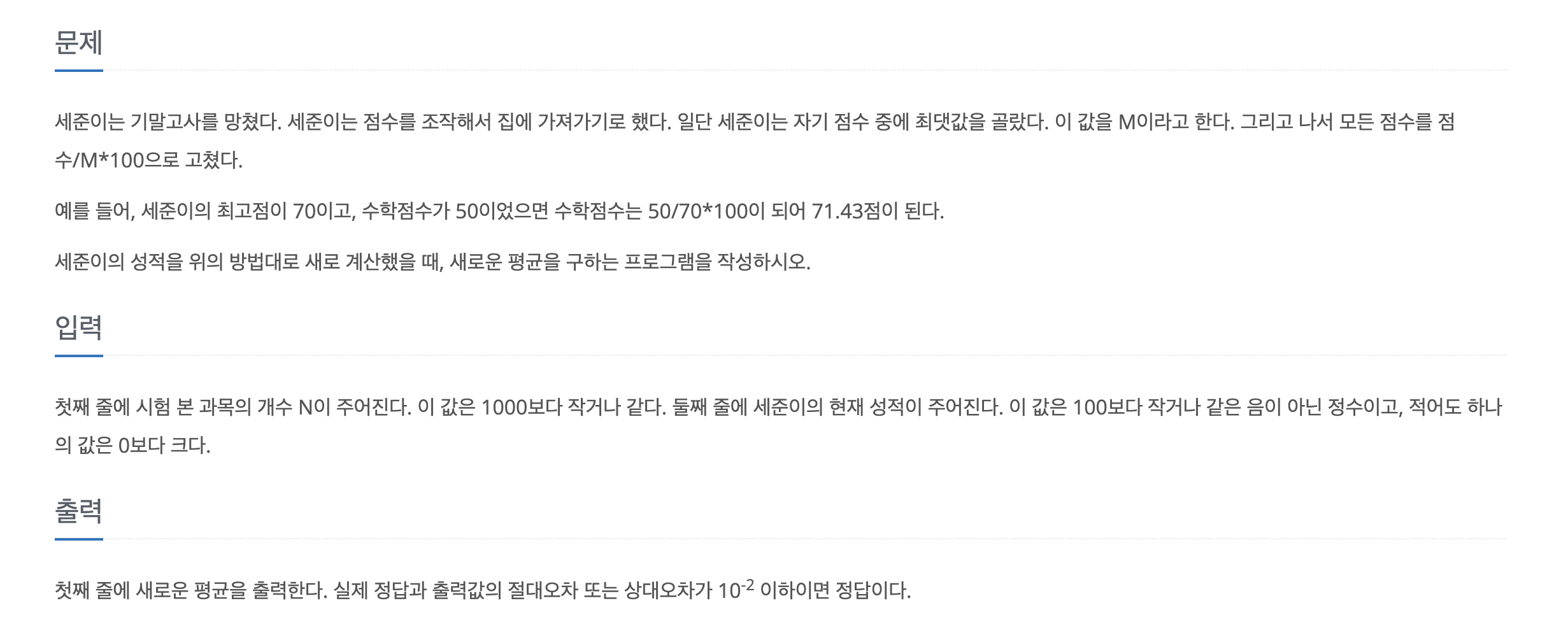 이를 활용해서 모든 점수를 점수/M*100 를 만든다음 평균을 내면 정답