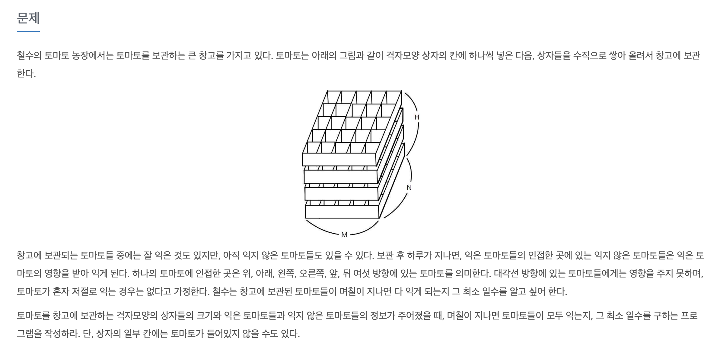 - 문제를 보면 토마토가 1개 이상은 무조건 들어가 있다. -> 조건 하나 줄일 수 있다.
