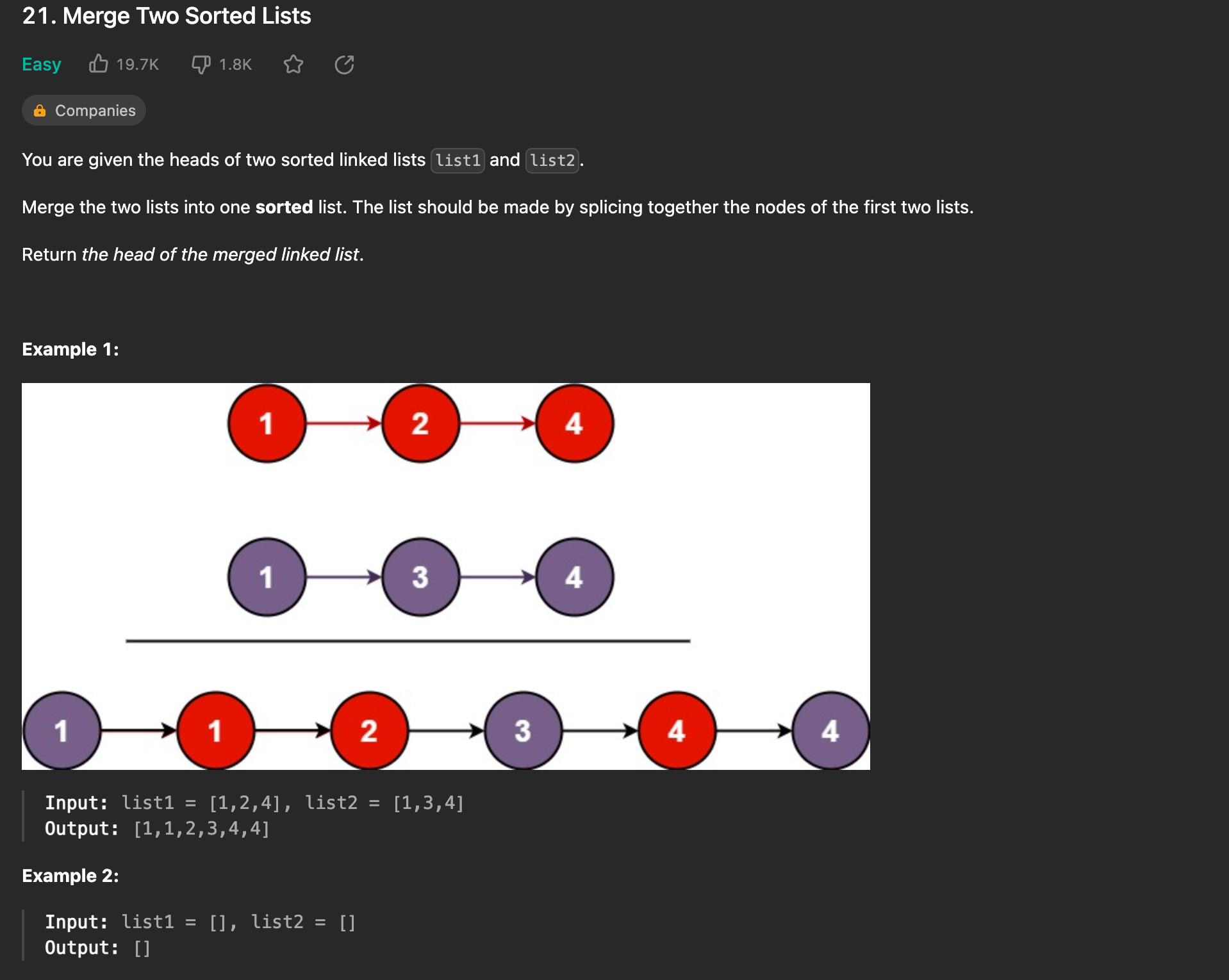 public ListNode mergeTwoLists(ListNode list1, ListNode list2) {